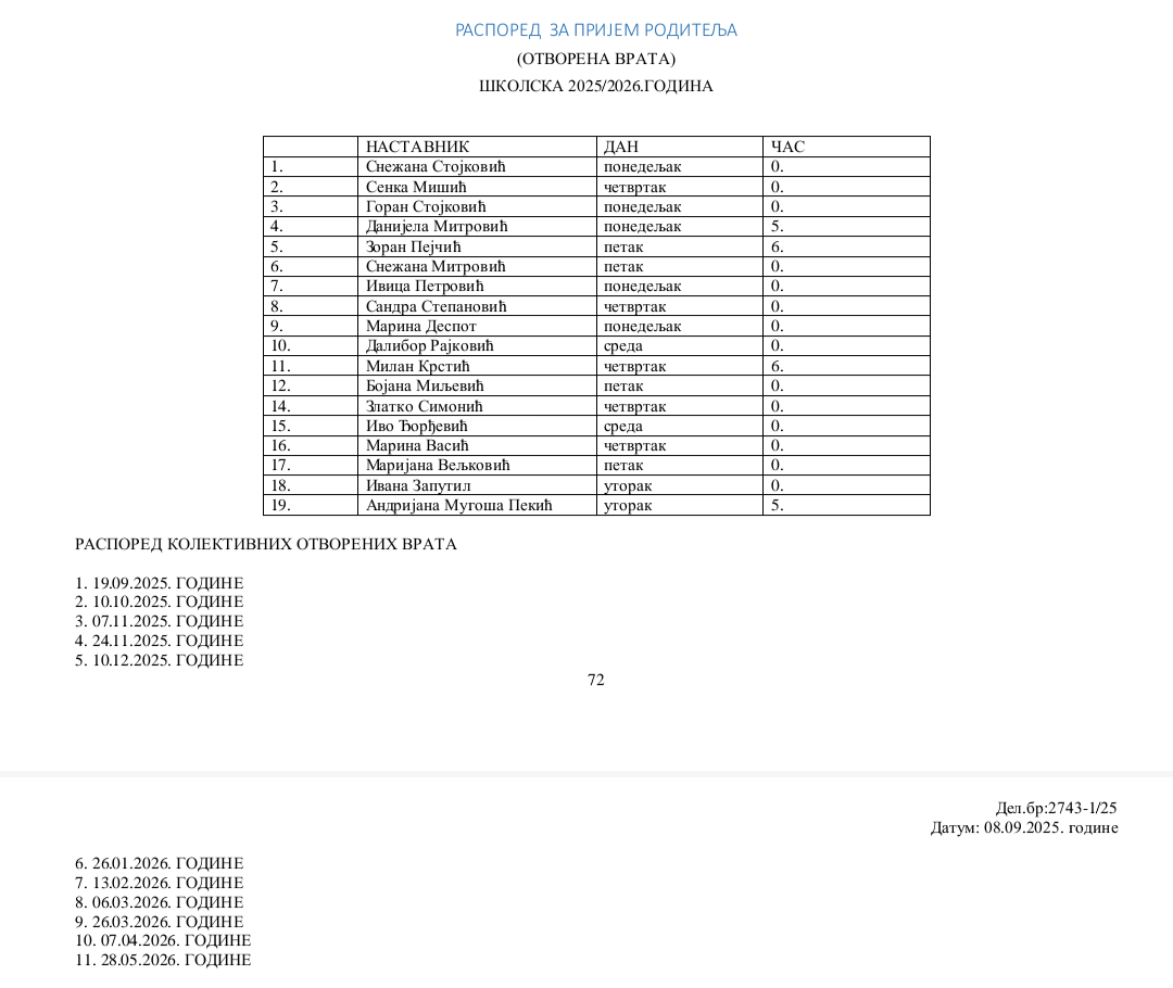Распоред за пријем родитеља (отворена врата) за школску 2025/2026. годину